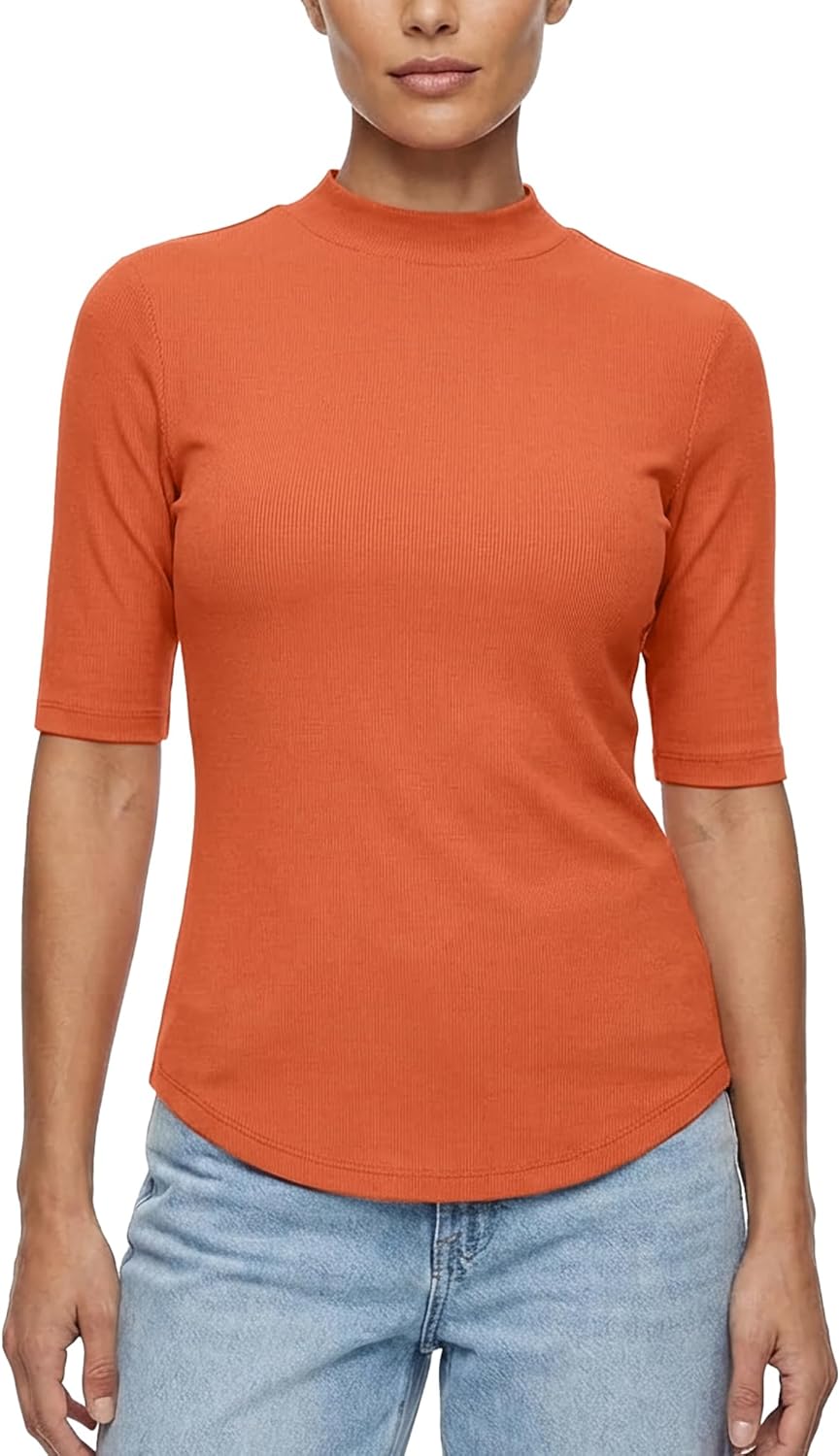 Zengjo Womens Mock Turtleneck Elbow Sleeve Tops - Fitted Stretch Ribbed Shirt for Work & Casual Wear