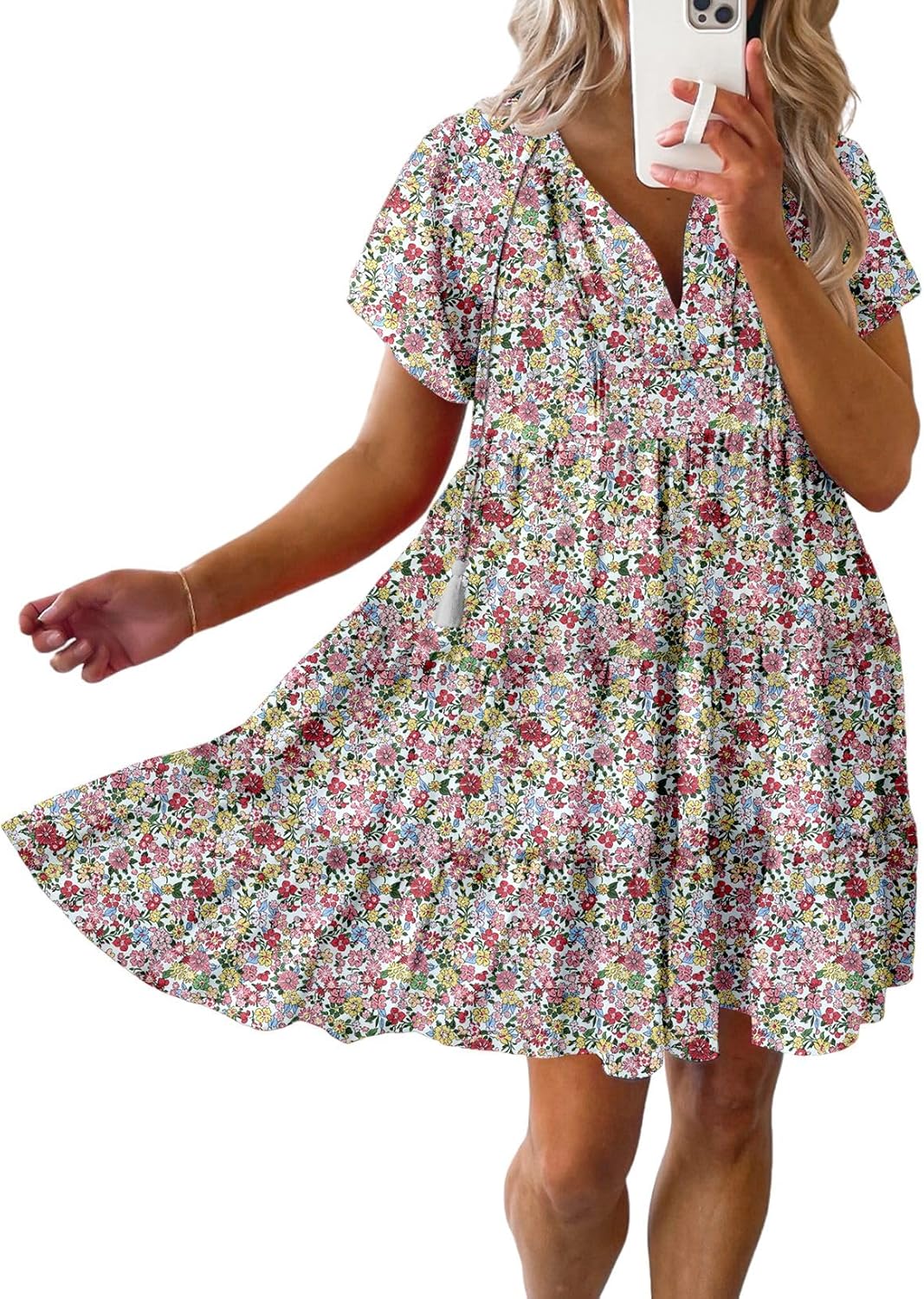 Dokotoo Womens Summer Casual Boho Floral Dresses 2026 V Neck Short Sleeve Sundresses Flowy Swing A-Line Mini Dress