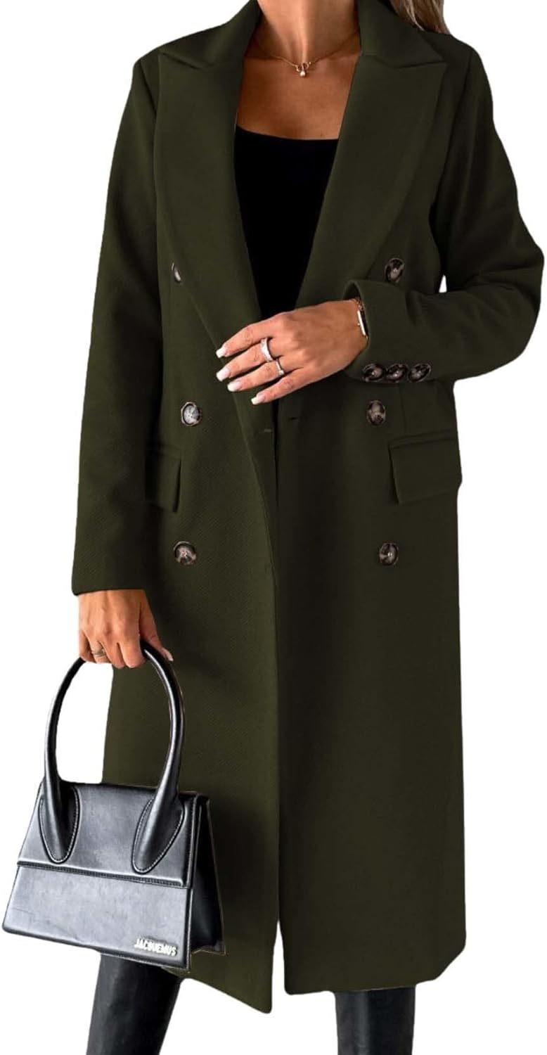 Womens Solid Color Double Breasted Medium Length Slim Coat Winter Casual Lapel Wool Jacket Coat