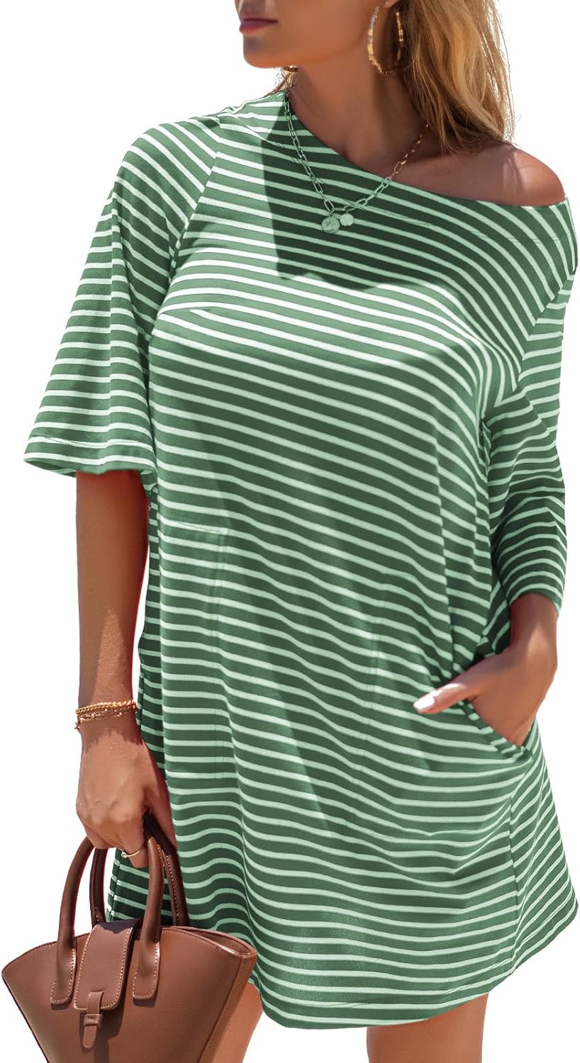 EXLURA Women's Summer T Shirt Dress Casual Short Sleeve Loose Striped Mini Dresses 2026 Vacation Beach Sundress Pockets