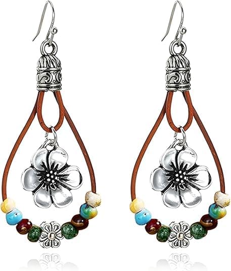 Leather Rope Flower Earrings for Women Handmade Vintage Dangle Drop Earring olorful Round Flower Jade Earrings Boho Western Ethnic Jewelry Gifts