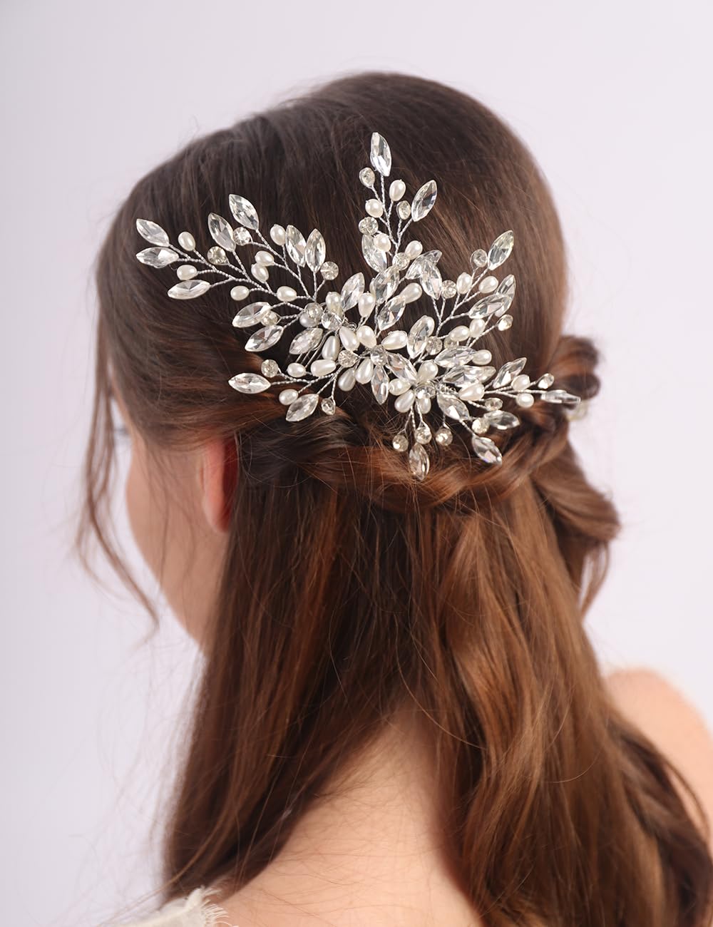Teyglen Bridal Rhinestone Wedding Hair Comb Silver Crystal Pearl Side Comb Bridal Hair Piece Wedding Hair Accessories for Women Girls