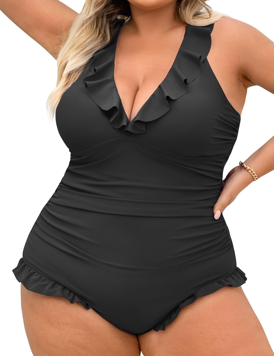 One Piece Swimsuit Women Plus Size Deep V Ruffle Neck Bathing Suit Cross Straps Tummy Control Modest Swimwear XL