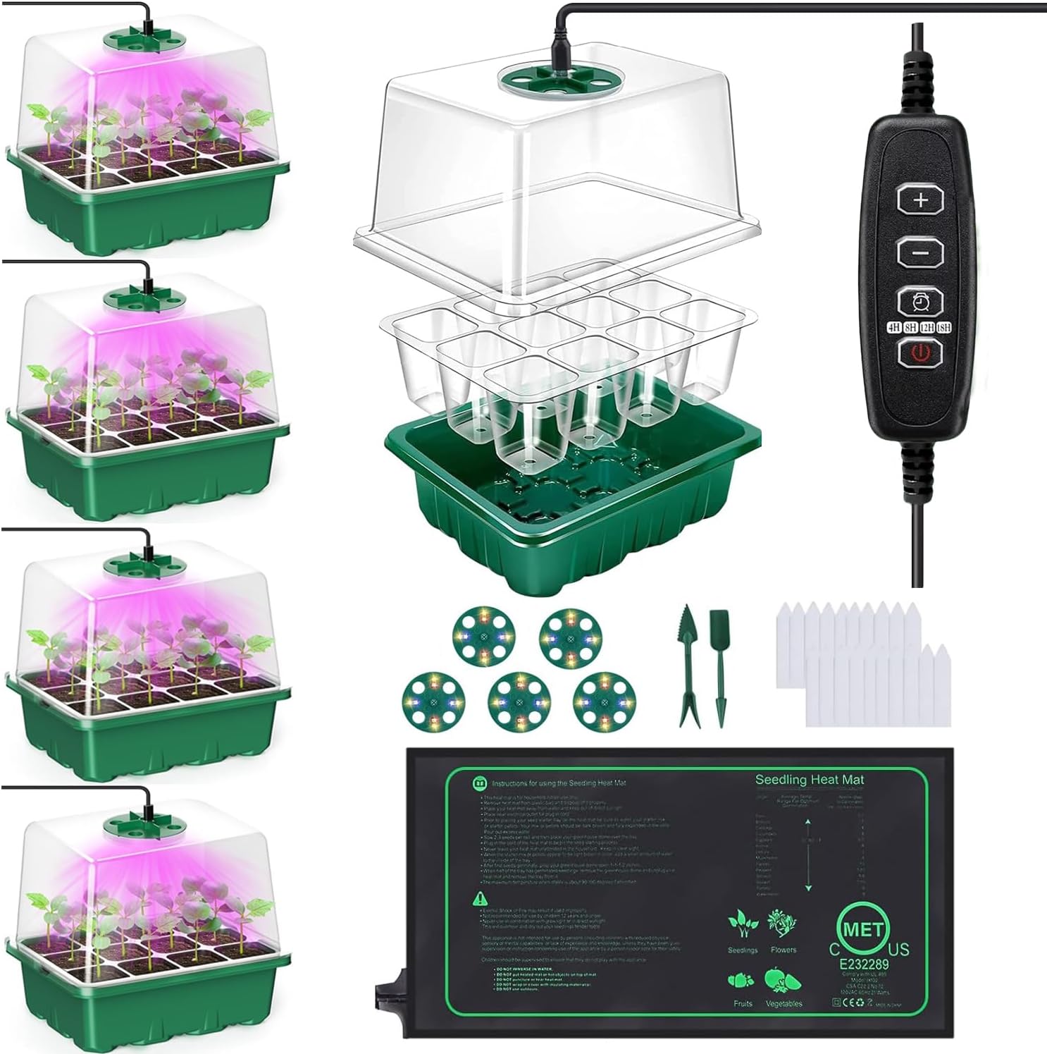 5 seed starter trays, 1 thermostatic heating mat, 5 LED grow lights