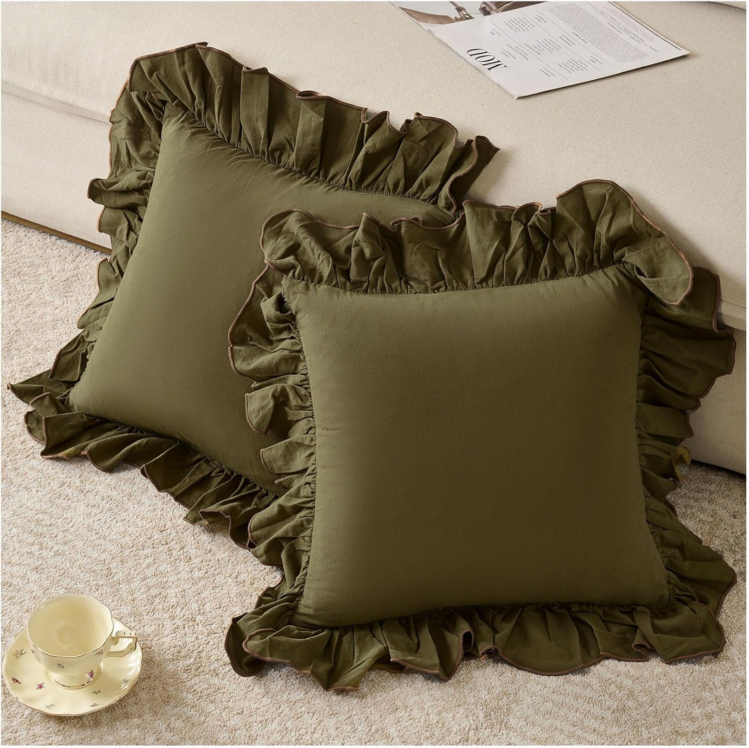 Zealax Olive Green Gorgeous Ruffle Throw Pillow Covers 18x18 Inch, Chic Washed Cotton Pillow Cases Decorative Vintage Pillow Shams Cushion Cover for Bed Couch Living Room Farmhouse Decor, Set of 2