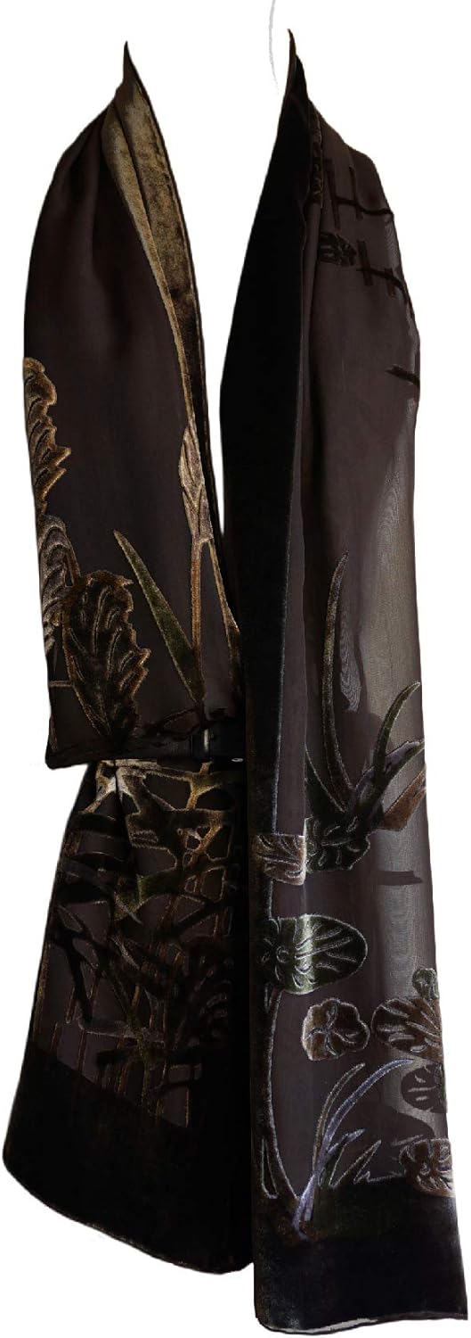 Silk Base Burn-out Velvet Shawl, 72" L x 21" W, Reed Catkin, Cocoa Brown