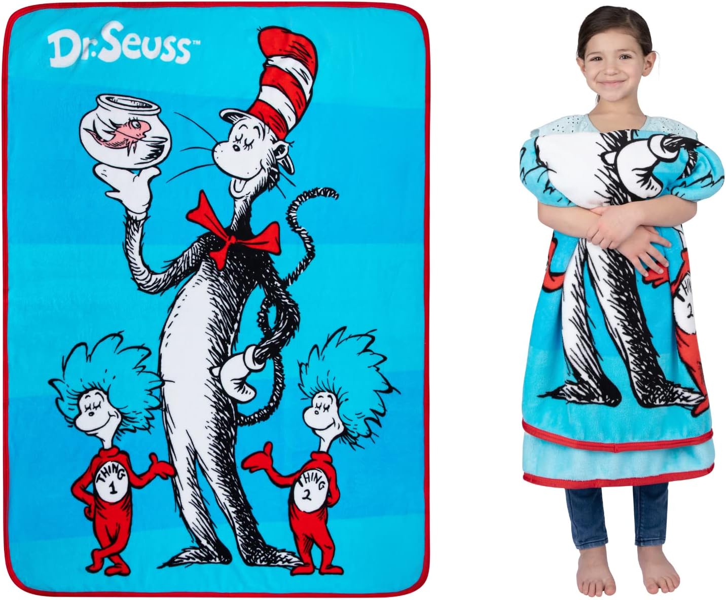 - DR SEUSS CAT IN THE HAT DESIGN: The iconic Dr. Seuss character The Cat in the Hat and his companions Thing 1 and Thing 2 are ready for some cozy fun and adventure with this "Playful Cat" themed plush throw.