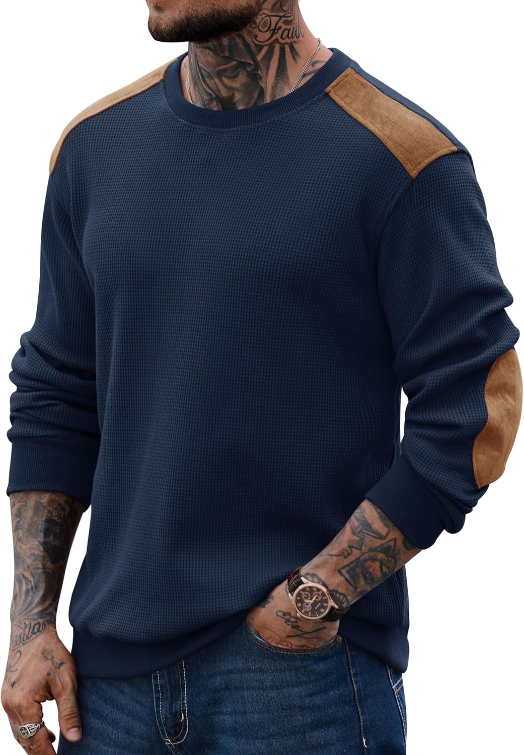 Men Waffle Elbow Patch Shirt Western Long Sleeve Fall Pullover(S-2XL)