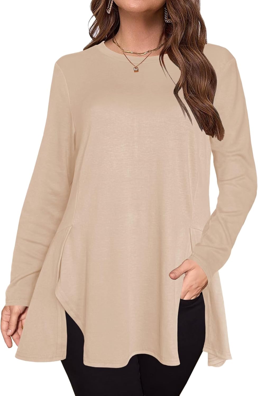Afibi Crew Neck Long Sleeve Tunic Tops for Women Loose Fit Dressy for Leggings with Side Split