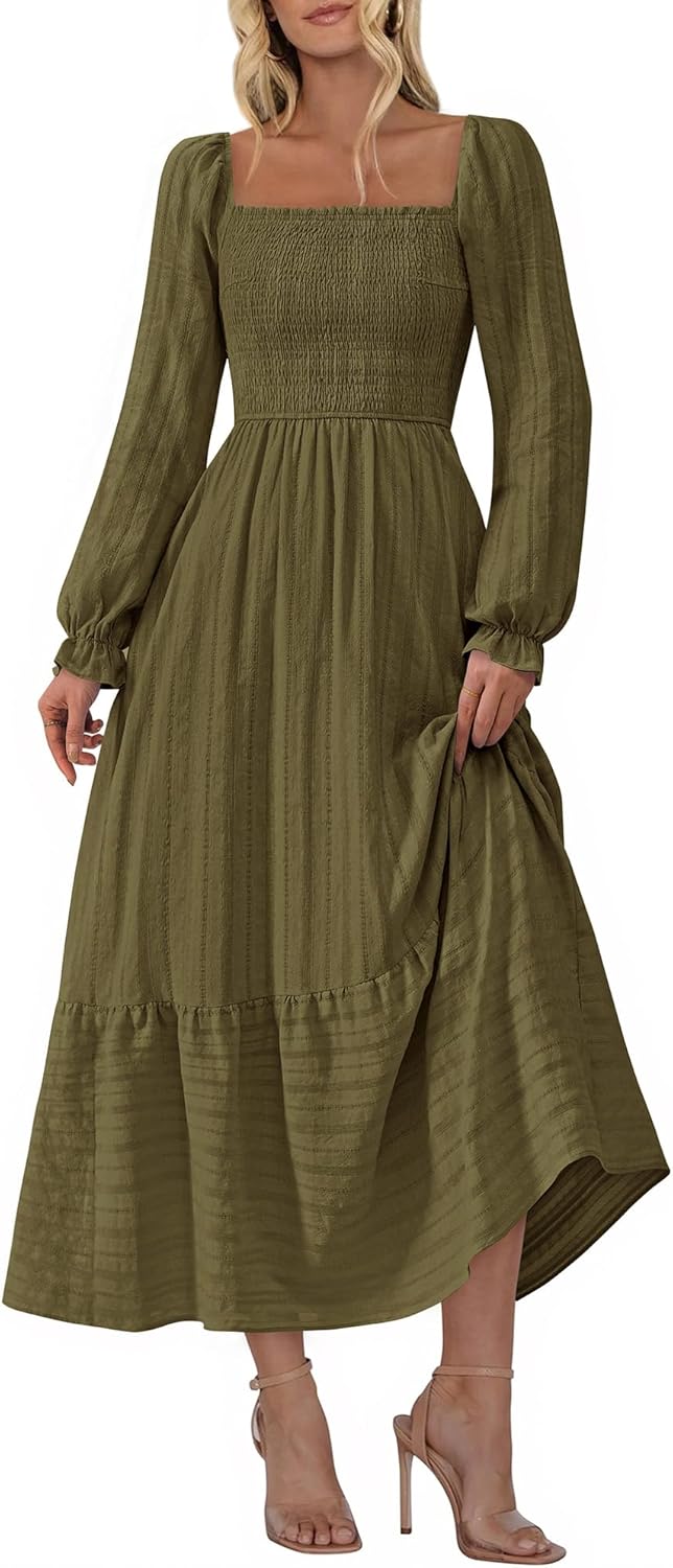 BTFBM Women Maxi Fall Dresses 2025 Long Sleeve Solid Color Square Neck Smocked Boho Long Wedding Guest Dress