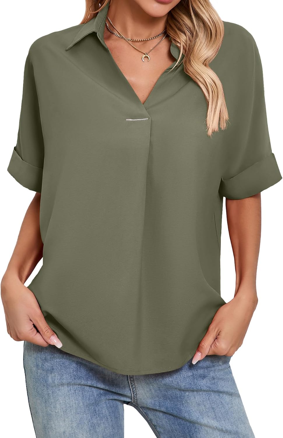 Womens Business Casual Shirts Short Sleeve Collared V Neck Work Blouses Loose Fit Casual Tops Army Green Large