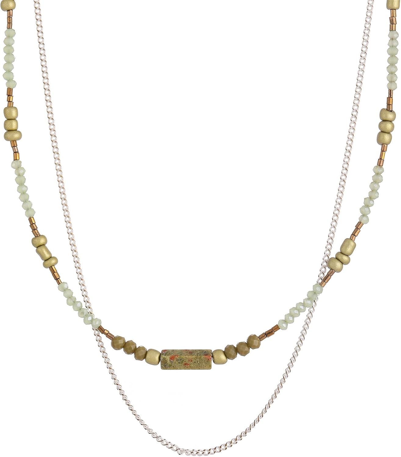 Beaded Necklace for Women Trendy, Boho Beaded Glass Silver Mixed Strand Short Necklace for Women Stacking layered necklaces Summer Beach Jewelry