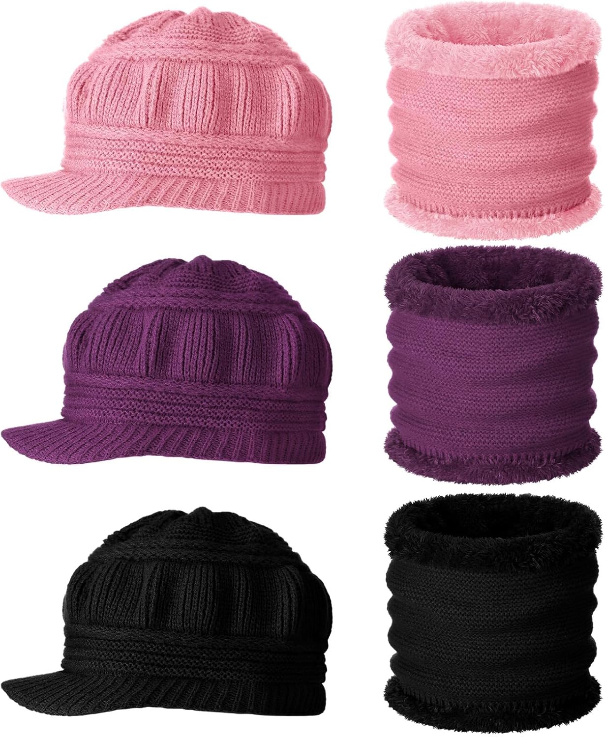6 Pcs/3 Set Winter Hats with Brim for Women Neck Warmer Set Knit Beanie Hat Soft Warm Neck Scarf Stylish Skull Cap for Women