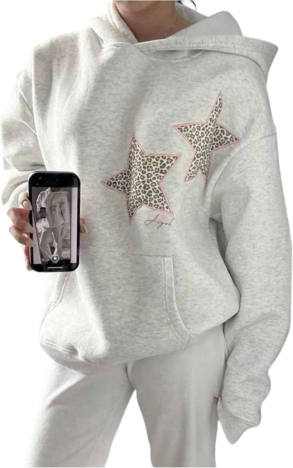 Verdusa Women's Leopard Star Oversized Hoodies Fleece Sweatshirts Fall Tops with Pockets