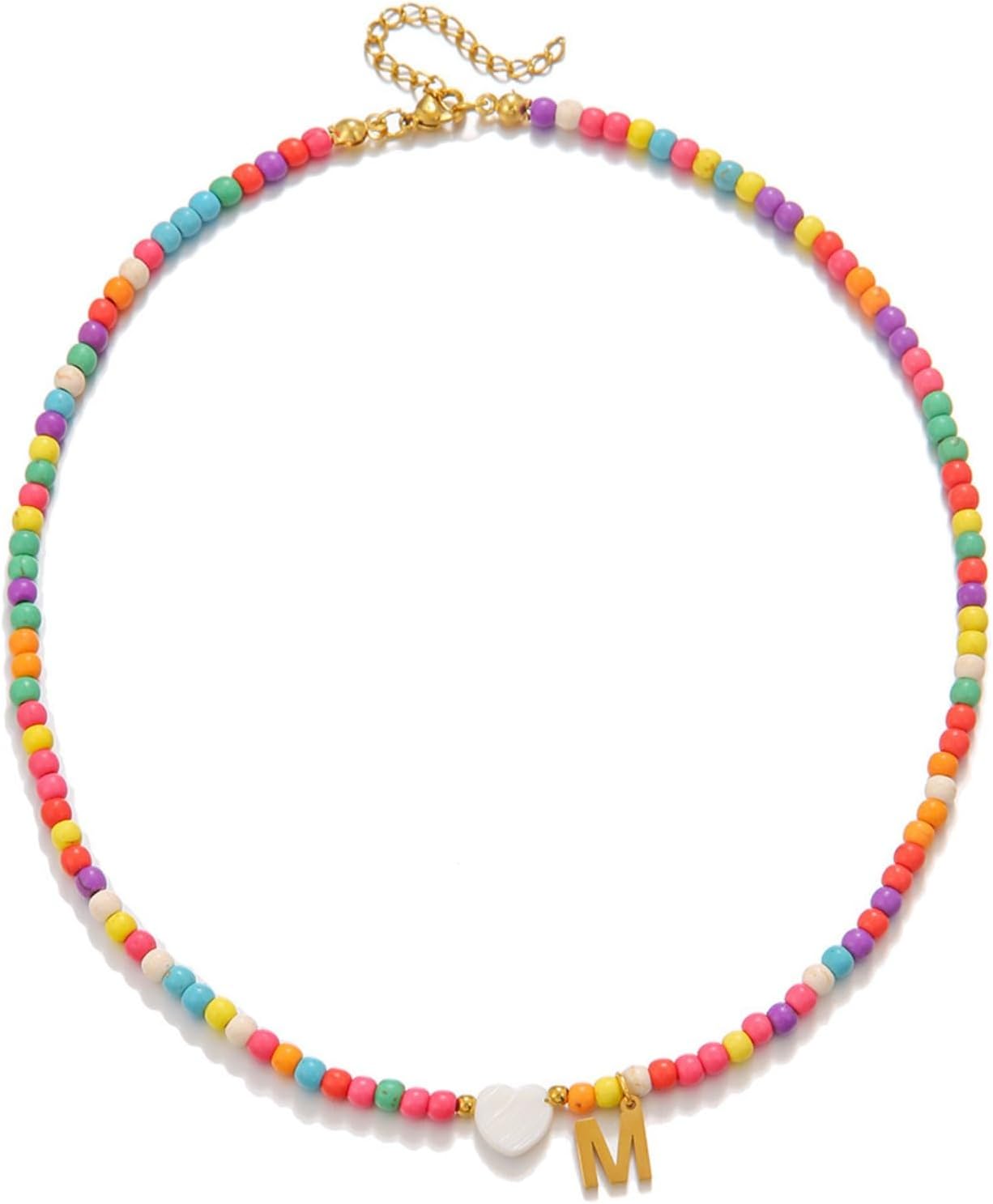 Initial Necklace for Women Handmade Dainty Bohemian Colorful Beaded Initial Choker Necklace Stainless Steel Love Heart Letter Pendant Necklace Y2K Aesthetic Jewelry