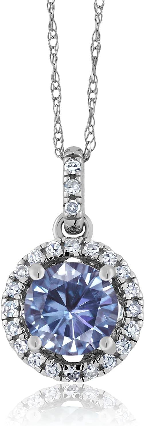 Gem Stone King 14K White Gold Pendant with Chain Round Persian Blue Moissanite and Diamond White (0.97 Cttw)