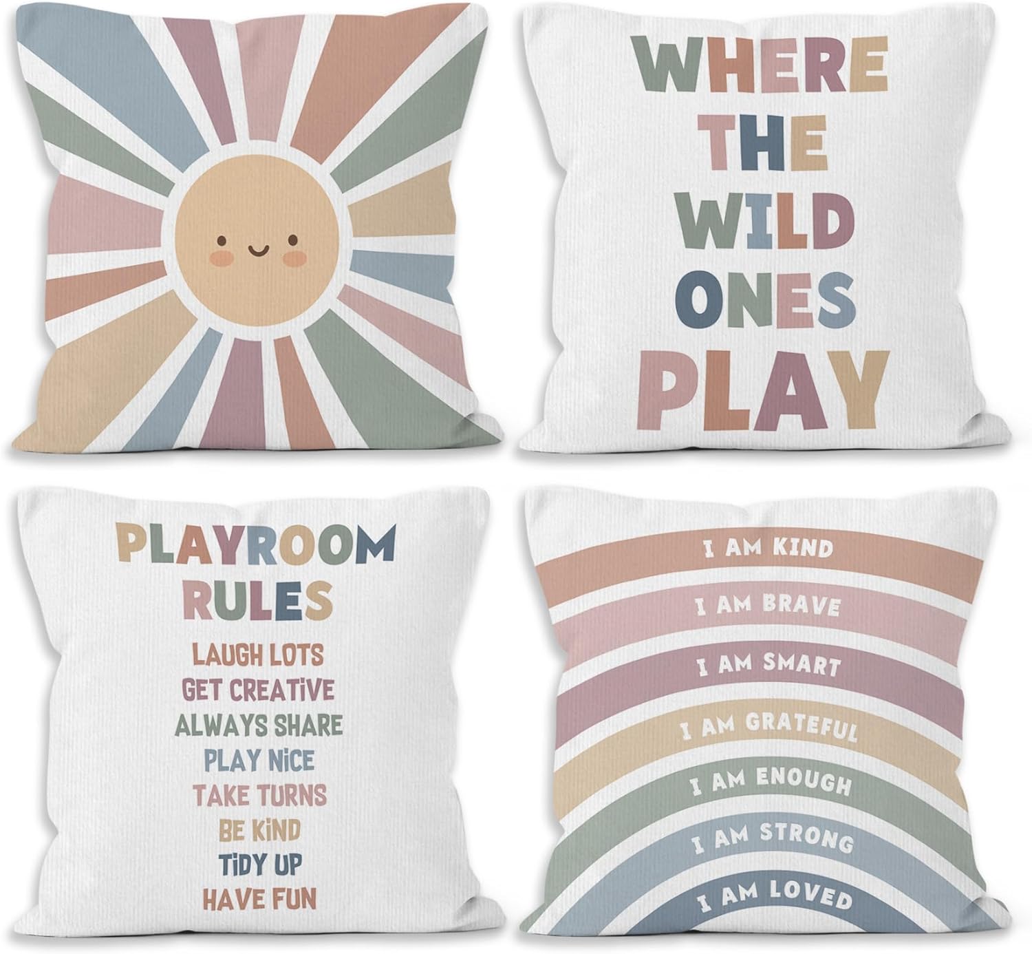 Boho Sun Rainbow Classroom Playroom Throw Pillow Covers 18x18 Set of 4, Inspirational Positive Affirmations Decor Pillow Cases Gifts for Nursery, Playroom Rules Square Pillowcases for Couch