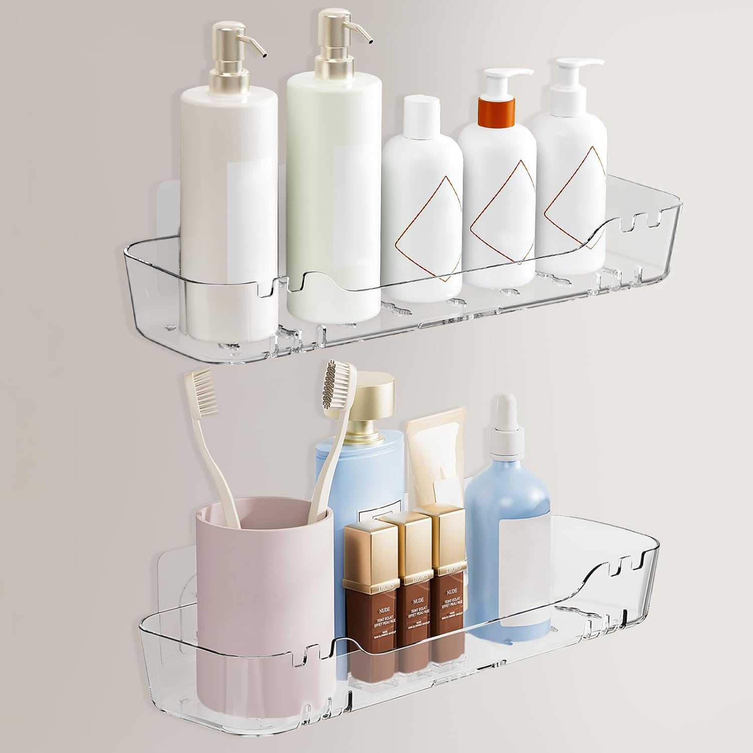 - Versatile Shower Caddy: Our bathroom shelves require no drilling or tools and it will not damage the walls. Ideal for daily use in shower rooms, bathrooms, kitchens, rentals, dorms, apartments, pantry cabinet, Rvs, and utility rooms. In addition to storing bathroom supplies, these clear acrylic shelves can also hold tissues, condiments, spices, candles, wipes, jars, and other items, maximizing storage versatility bathroom spaces