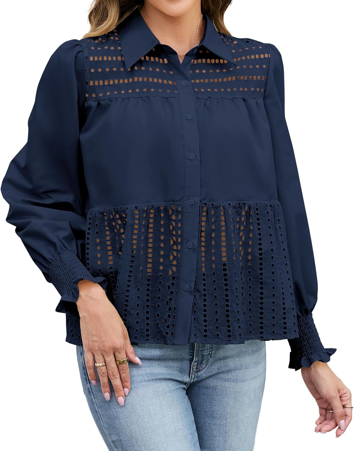 Women's Casual Embroidered Ruffle Long Sleeve Shirts Loose Button Up Shirt Fall Eyelet Blouses Tops Fashion Clothes 2025