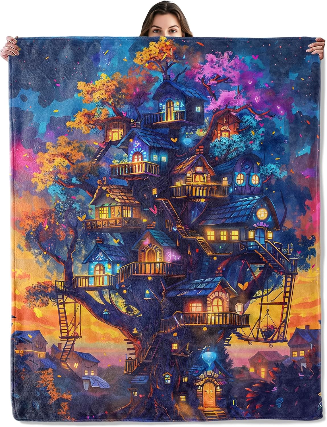 Magical Treehouse Village Throw Blanket for Boys Girls Kids Adults, Cozy Fantasy Treehouse Theme Flannel Blankets Gifts for Camping, Bedroom, Couch, Room Home Decor, 50"x60"