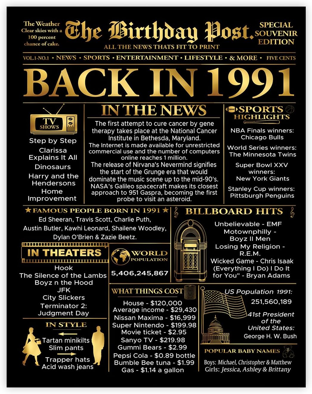 - MAKE THEM SMILE WITH THIS IDEAL 35th BIRTHDAY GIFT IDEA: This exceptional quality poster for her or him shows the design 'Born In 1991 Newspaper'. If you are looking for birthday canvas for pictures, then then this happy birthday gift is bound to make them smile. Not just for friendship gifts for men this could also be a birthday gift for Wife, Brother, Cousin, Neighbor, Nephew, Husband, Son or Auntie.