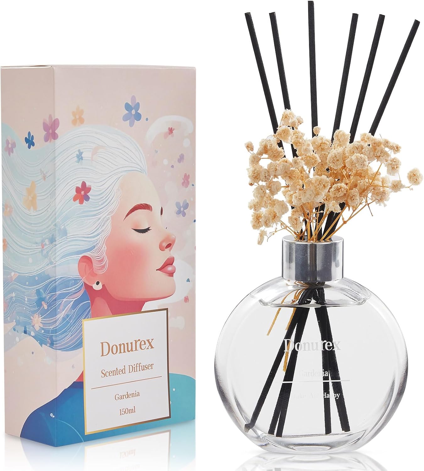 - Package Includes: The Gardenia scent diffuser with sticks includes 5.07oz of essential oil with simple and high class bottle, real baby breath flowers and 8 reed sticks