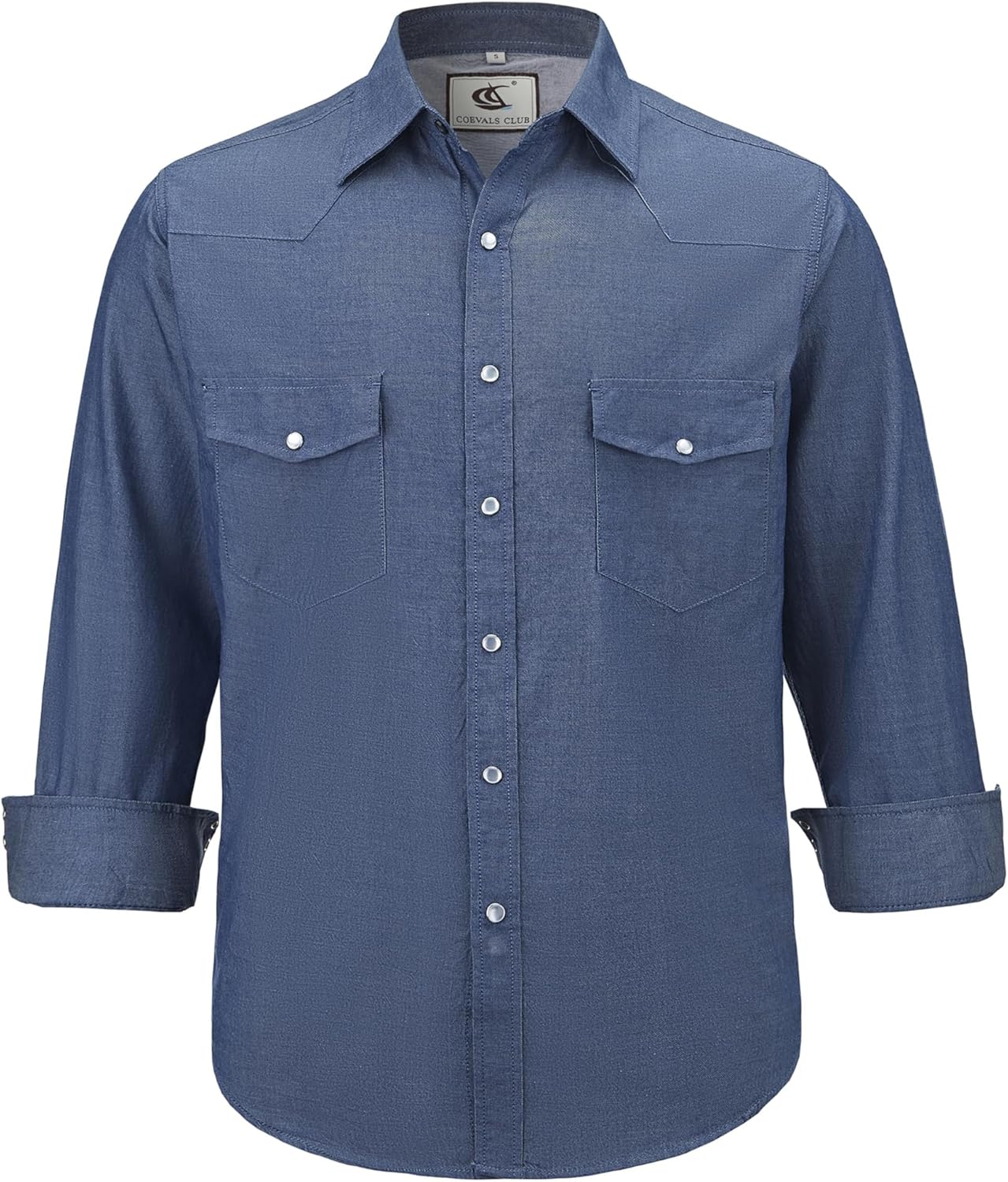 COEVALS CLUB Men's Denim Western Cowboy Pearl Snap Casual Button Down Up Dress Long Sleeve Soild Work Shirts(3# Dark Blue 2XL)