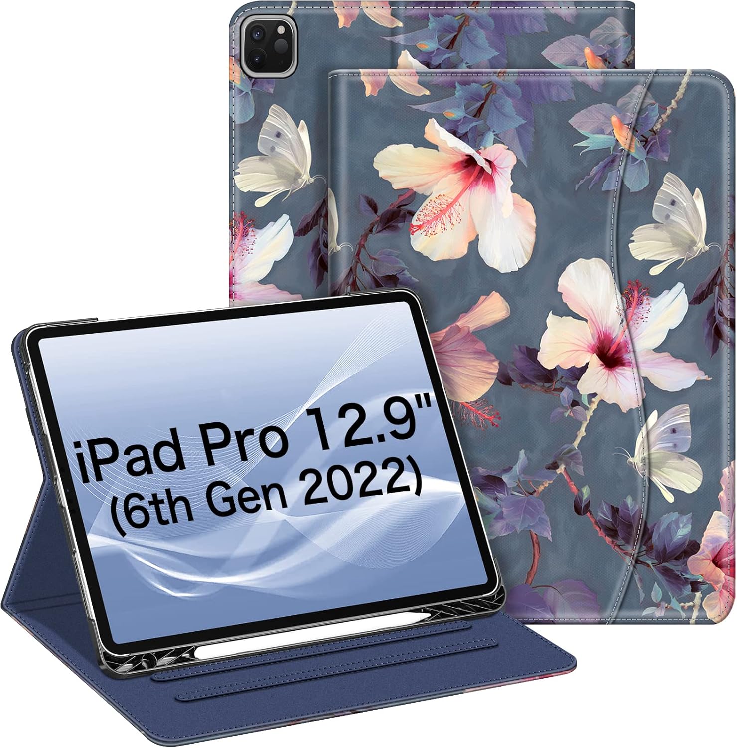 Fintie Folio Case for iPad Pro 12.9" 6th Generation 2022, Multi-Angle Smart Stand Cover w/Pencil Holder & Pocket, Also Fit iPad Pro 12.9 2021 5th & 2020 4th & 2018 3rd Gen, Blooming Hibiscus