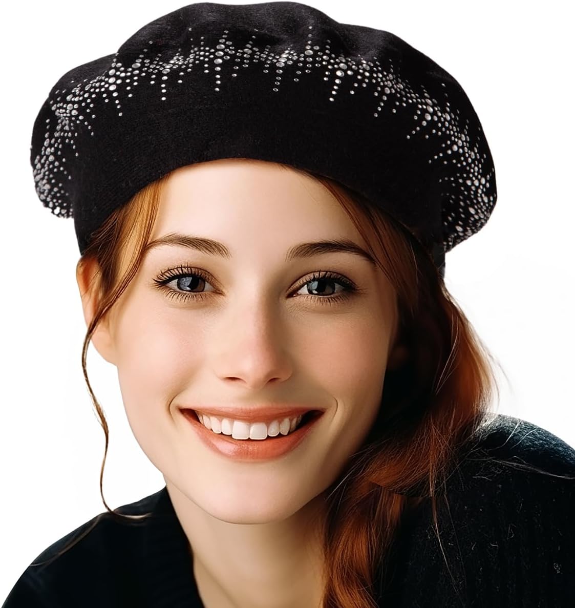 LADYBRO Rhinestone Beret Hats for Women 2 Layers Wool French Knit Cap Lady Winter Black