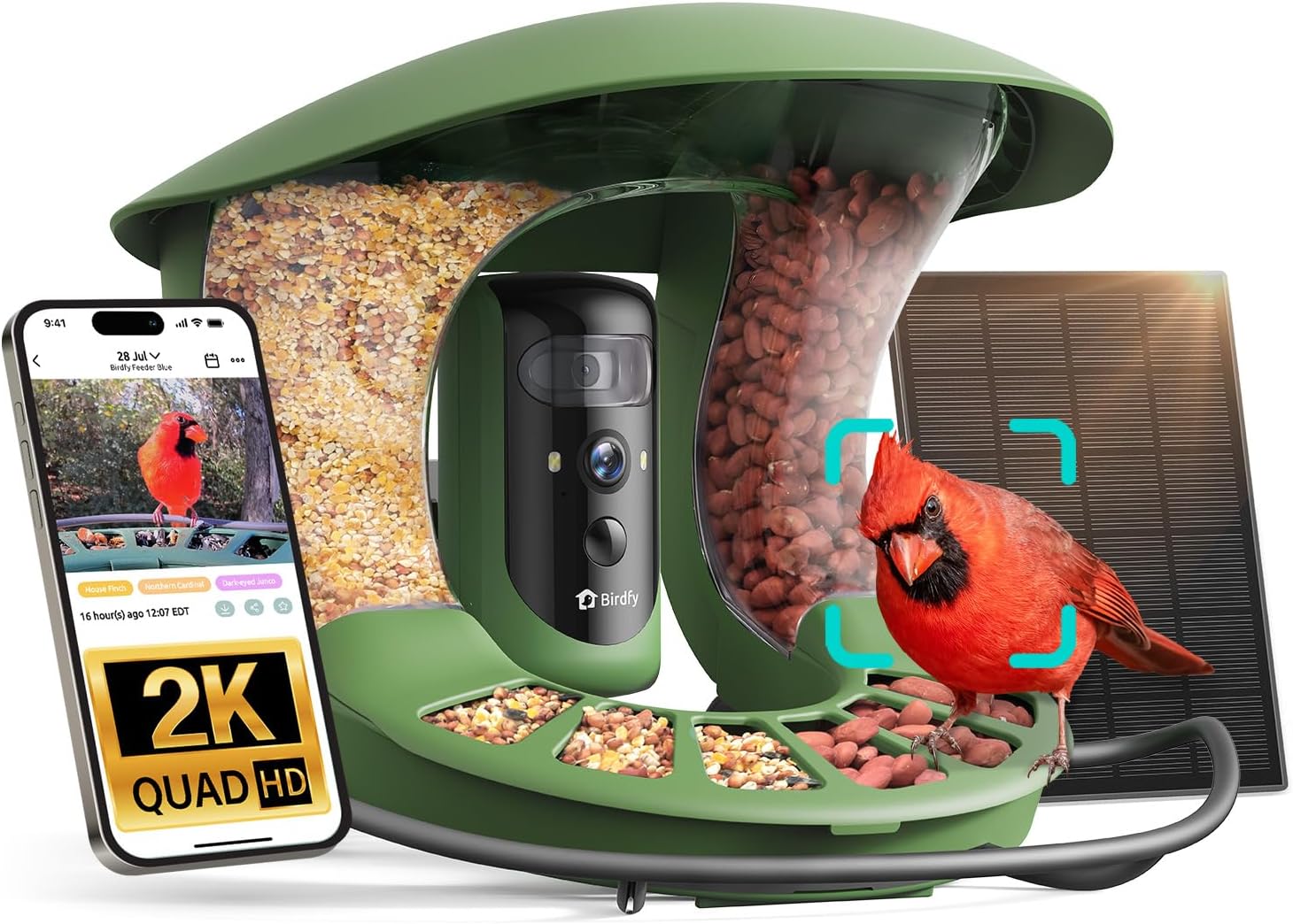 - THE ONLY DUAL-LENS BIRD FEEDER FOR CINEMATIC TRACKING.Most bird feeders with cameras miss the magic when birds move too fast—but not Birdfy. Its dual-lens AI tracking locks on instantly, capturing every motion in real time—everything you expect from a smart bird feeder with camera. The 2K lens shows each feather in stunning detail, while the 1080p wide lens frames the full scene. With Birdfy, you don’t just watch birds—you experience them.