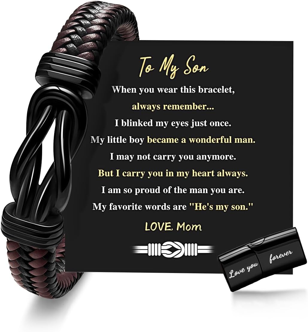 Gift for Men Infinity Knot Cuff Bracelet for Men Dad Husband Boyfriend Son Black Braided Leather Forever Linked Together Stainless Steel Engraved with Love You Forever Gifts Jewelry 7.5-9inch
