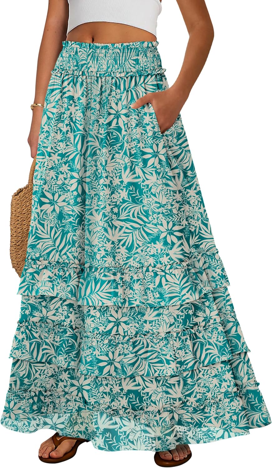ANRABESS Maxi Skirts for Women Summer Boho Tiered Flowy Elastic High Waist Beach Long Skirt Casual Spring Vacation Outfits