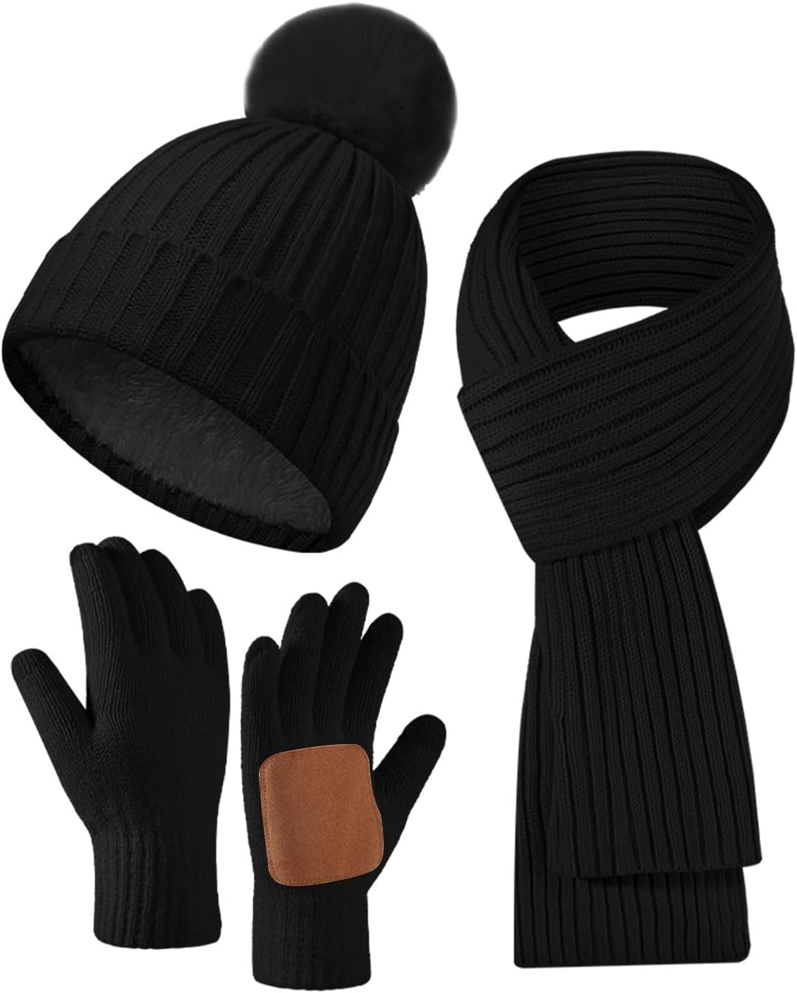 Women's Winter Beanie Hat Scarf Gloves Set,Fleece Lined Knit Pom Hat Long Scarf with Touchscreen Gloves Gifts for Women