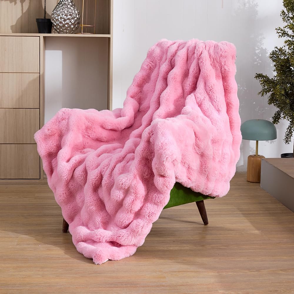 KayWing Faux Fur Throw Blanket: Pink Reversible Fuzzy Plush Bubble Fleece - Luxury Fluffy Blanket for Home Aesthetics Enthusiast Age 25-40 - Throw Size 50"x 60"