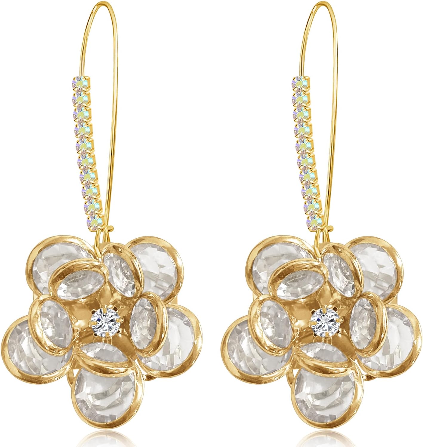 14K Gold Bohemian Sparkly Crystal Flower Dangle Drop Earrings Lightweight Rhinestone Camellia Flower Floral Hoop Earring for Women