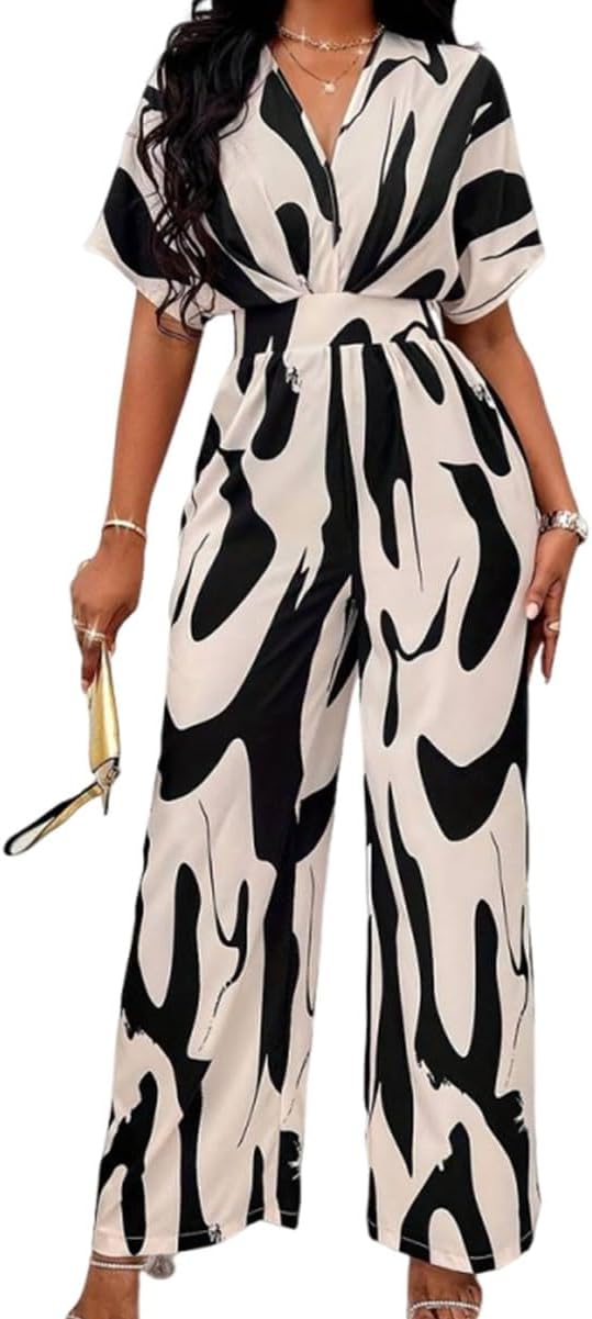 Scacto Women's Casual Jumpsuit Abstract Print Wide Leg Jumpsuits Short Sleeves Beach Rompers Long Pants