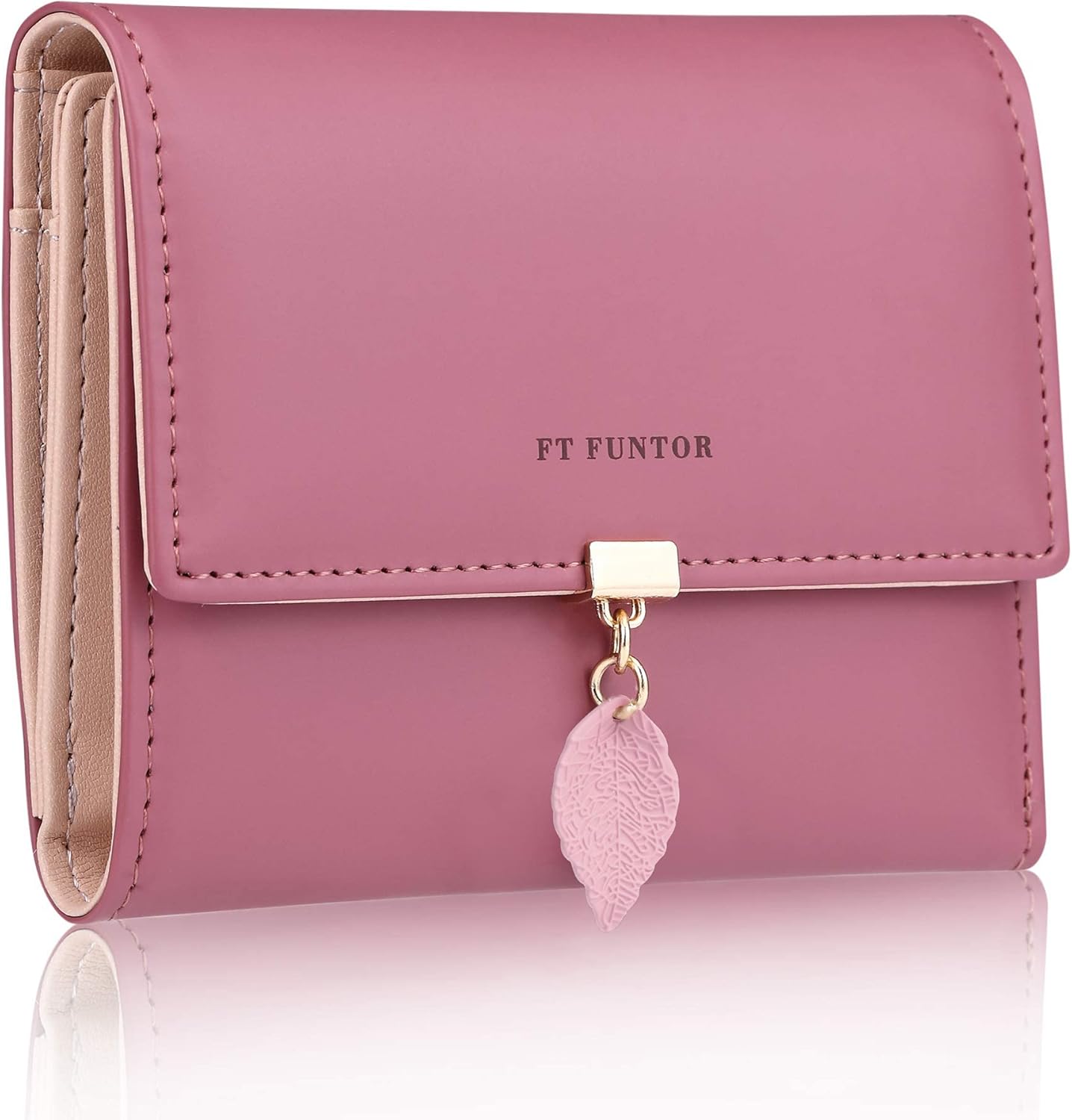 FT FUNTOR RFID Wallets for Women, Leaf Card Holder Trifold Ladies Wallets Coins Zipper Pocket with ID Window Deep Pink