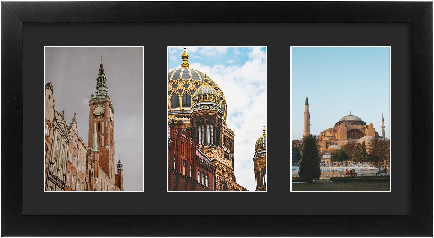 - Includes: One 9x18 Black Wood Frame, One Black Mat with Three 5x7 Openings (Opening Sizes: 4.5x6.5 Inches)