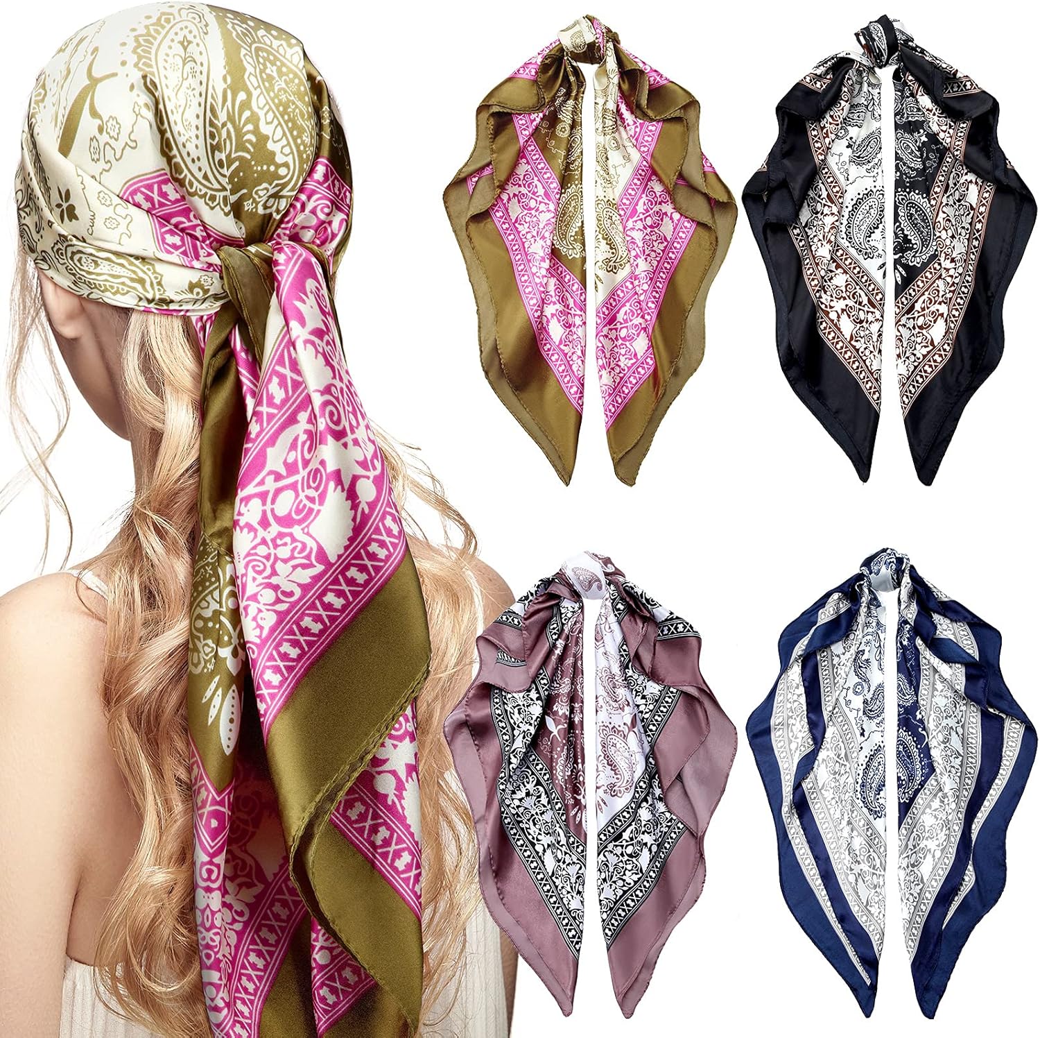 Honoson 4 Pcs 35 Inch Satin Head Scarf for Women's Hair Square Bandanas Large Silk Scarves for Sleeping