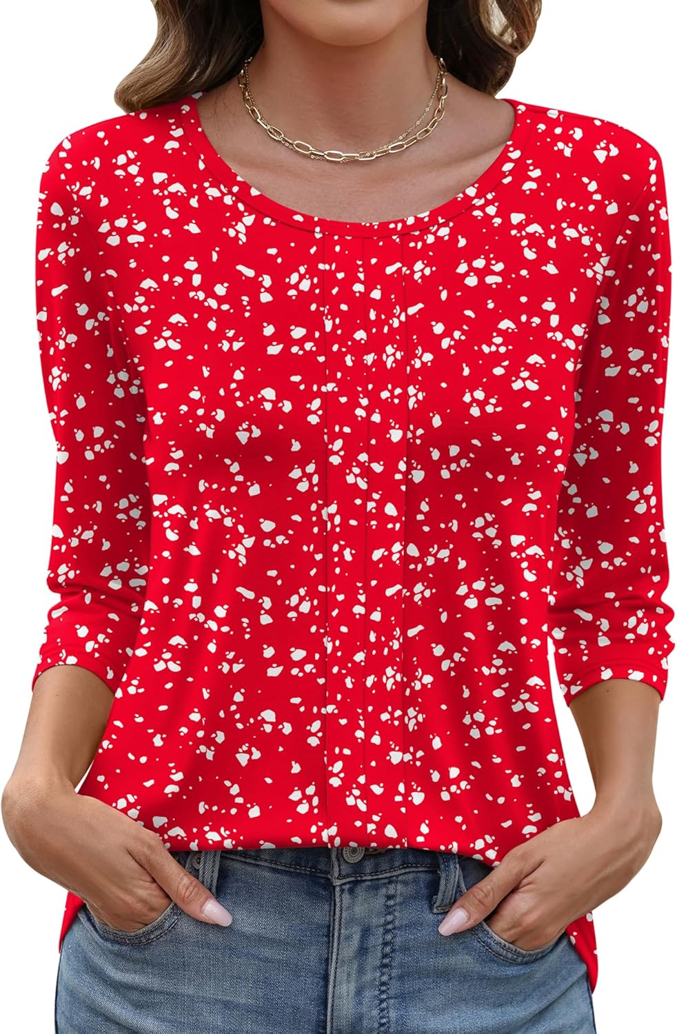 LOMON 3/4 Length Sleeve Womens Tops Casual Crewneck Spring Summer Pleated Tunic Tops Beach Vacation T Shirts
