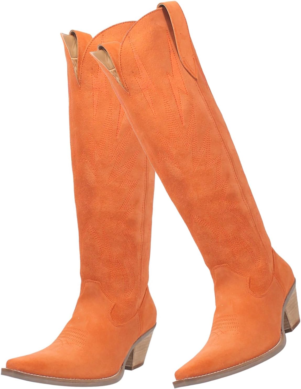 SHODENSE Women Suede Knee High Cowgirl Cowboy Boots Embroidered Stacked Heel Pointed Toe Tall Western Boots Pull On Wide Calf Low Chunky Heel Dress Long Boots Casual Suede Orange 8.5 M US
