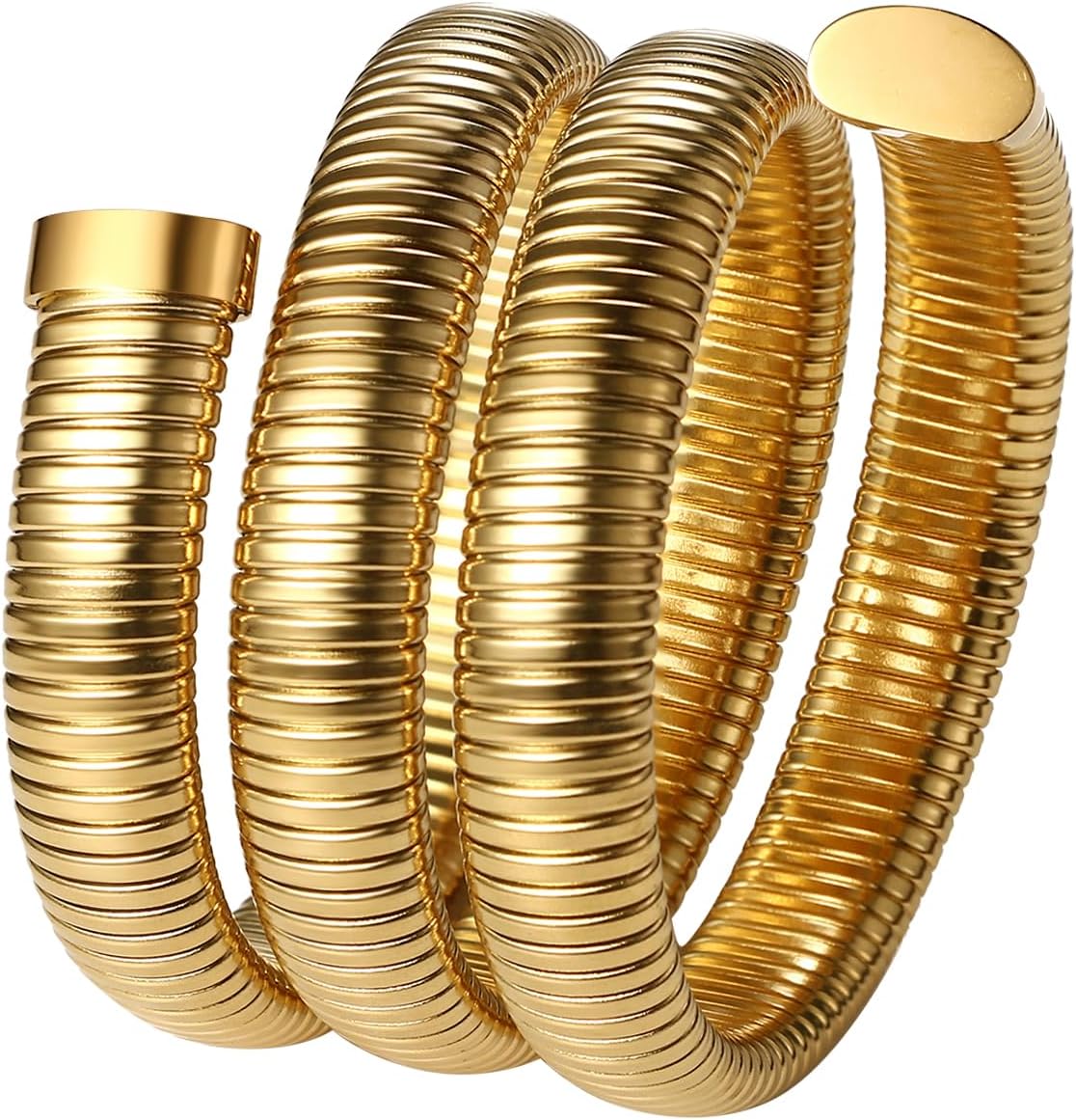 Emibele Gold Bangles Bracelet Set for Women, 18K Gold Plated Chunky Stainless Steel Non Tarnish Stretch Bracelet Stack, Flexible Wide Wristband Bangle Layered Snake Chain Bracelets