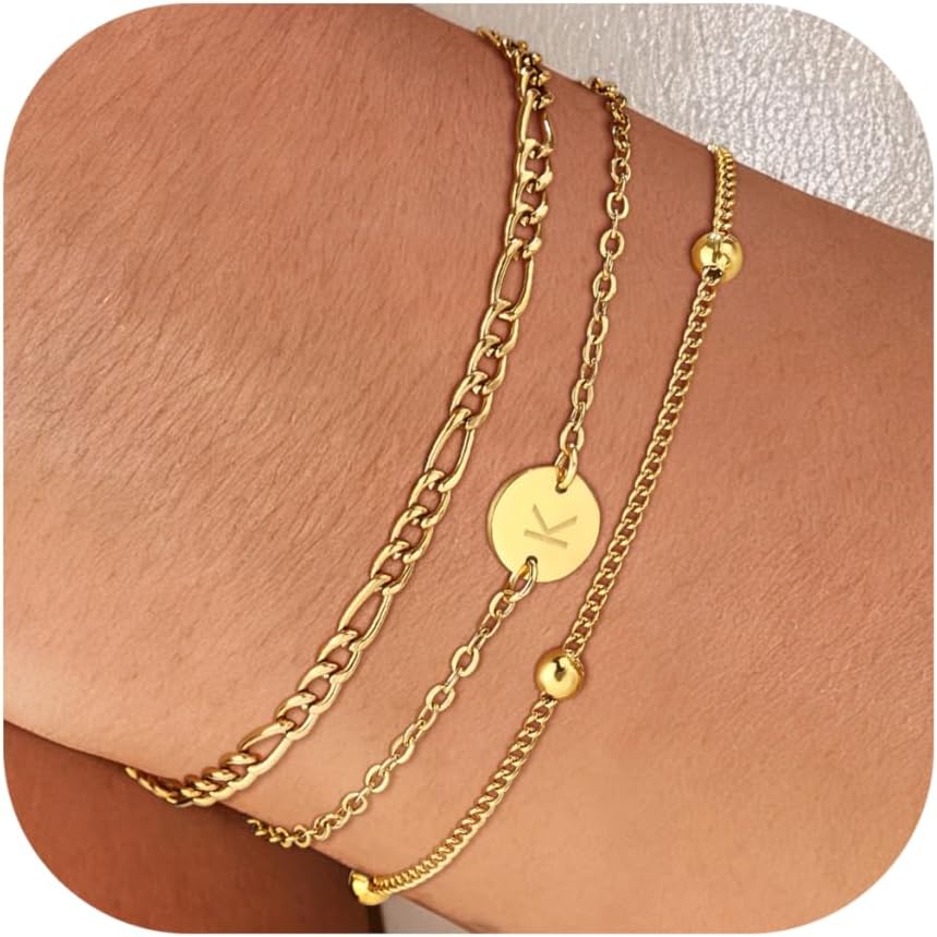 Valentines Day Gifts - 18K Gold Plated Initial Bracelets for Women - Stainless Steel Layered Letter Charm Bracelet A to Z - Gold Jewelry Christmas Birthday Gifts