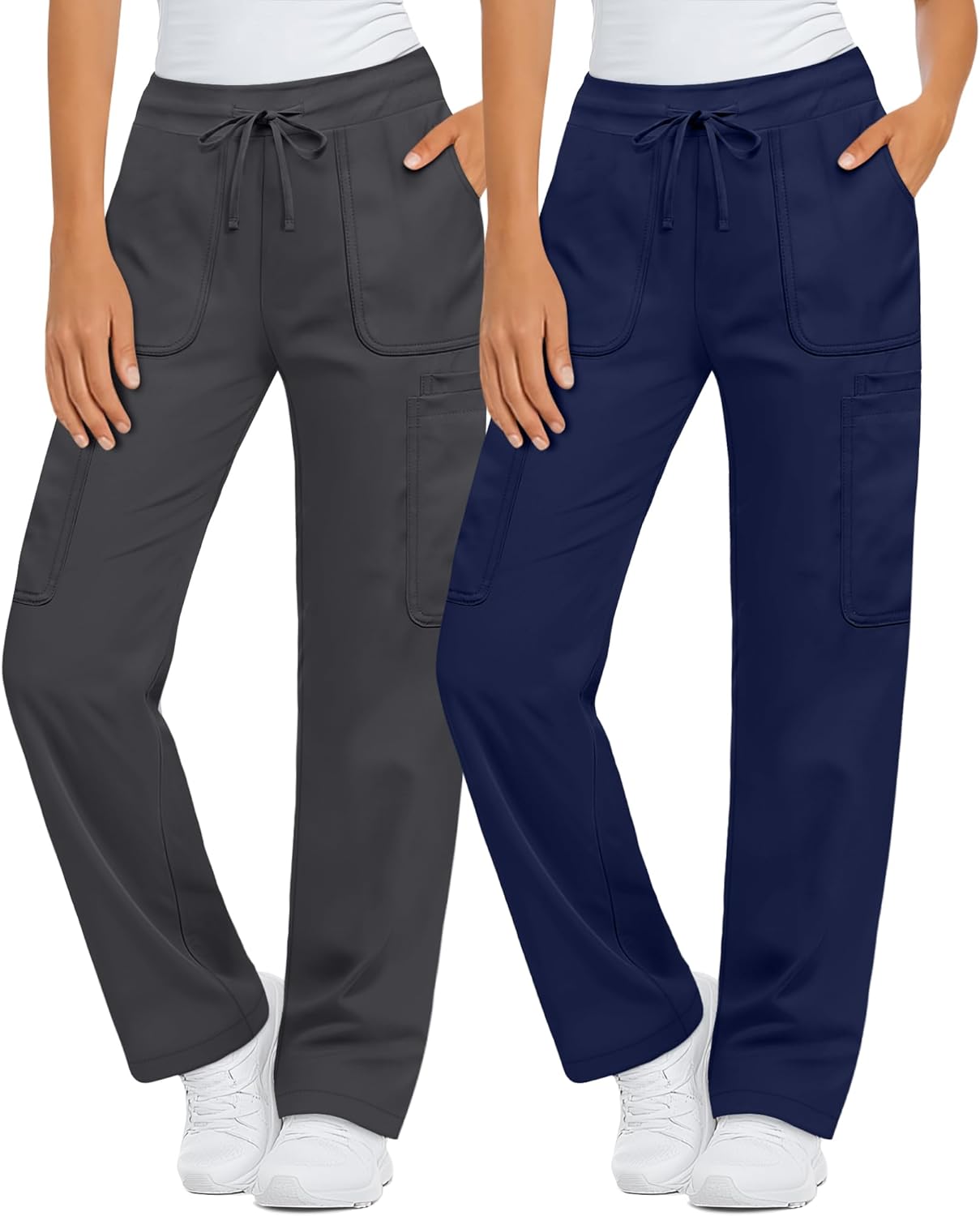 2 Pack Women's Scrub Pants Elastic Waist Drawstring Cargo Pants with 8 Pockets Straight Leg Casual Joggers