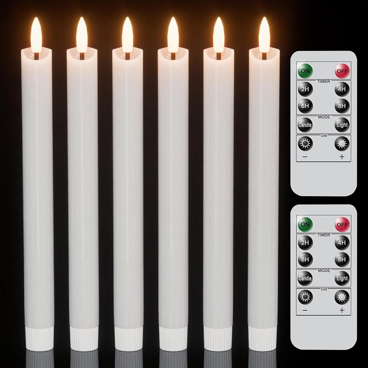 - Package Included: You will get 6pcs flameless flickering taper candles, two 10-Key remotes, one user manual. All candles are made by real wax, 0.78 inch diameter with 9.64 inch height, these flameless candle sticks could perfectly fit into your candle holders as wonderful decoration for living room, fireplaces, and dining rooms.