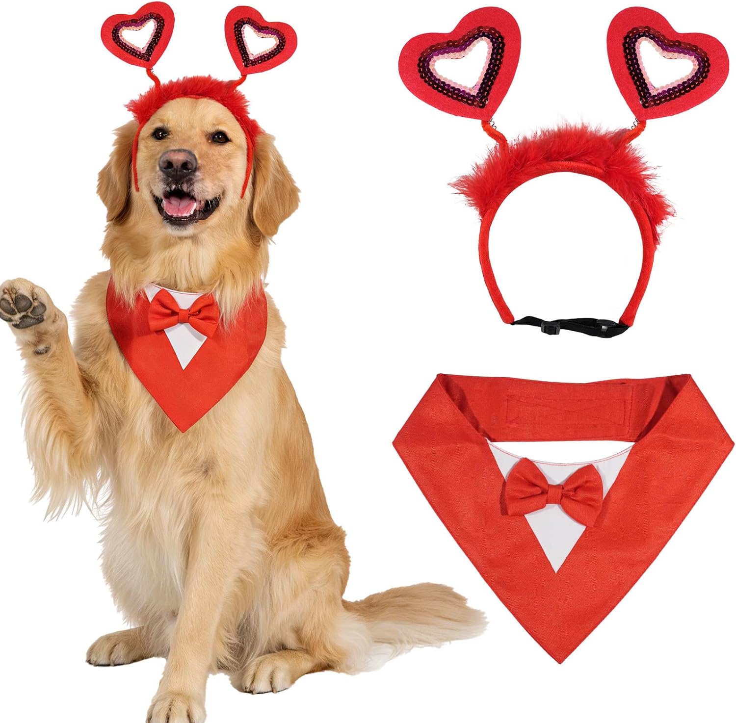 Valentines Day Dog Costume Set Romantic Dog Accessories with Heart Headband and Red Tie Cravat Pet Outfit for Engagement Wedding Party Supplies