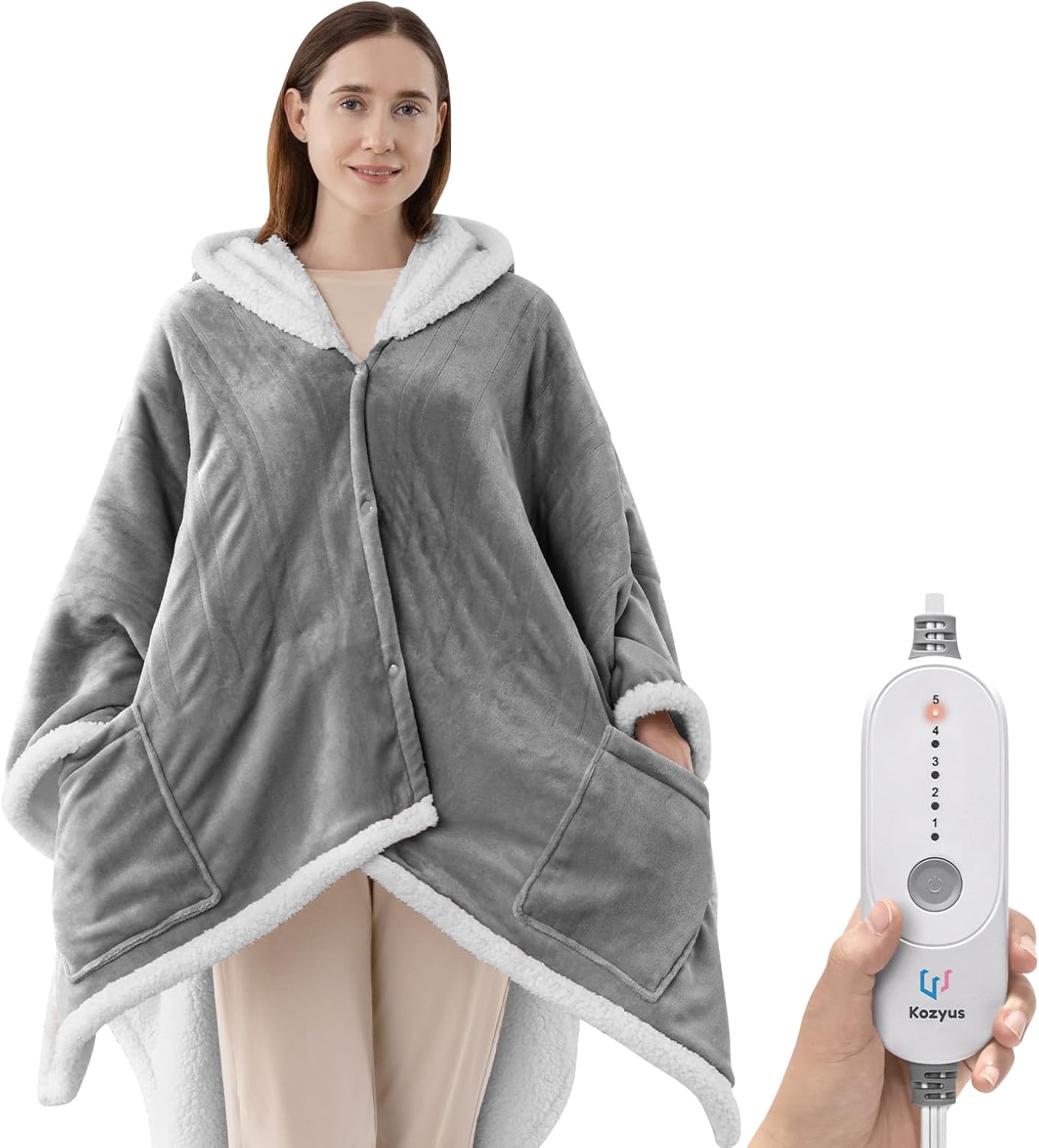 - RELAXED FIT & FULL COVERAGE - Measuring 56" x 63", this wearable heated shawl drapes comfortably over your shoulders and body for full upper-body warmth. Snap buttons along the front let you secure it as a heated poncho or use it open as a heated throw blanket to stay cozy. The roomy hood and fleece-lined hand pockets keep you warm while allowing free movement - perfect for lounging, napping, or working at your desk