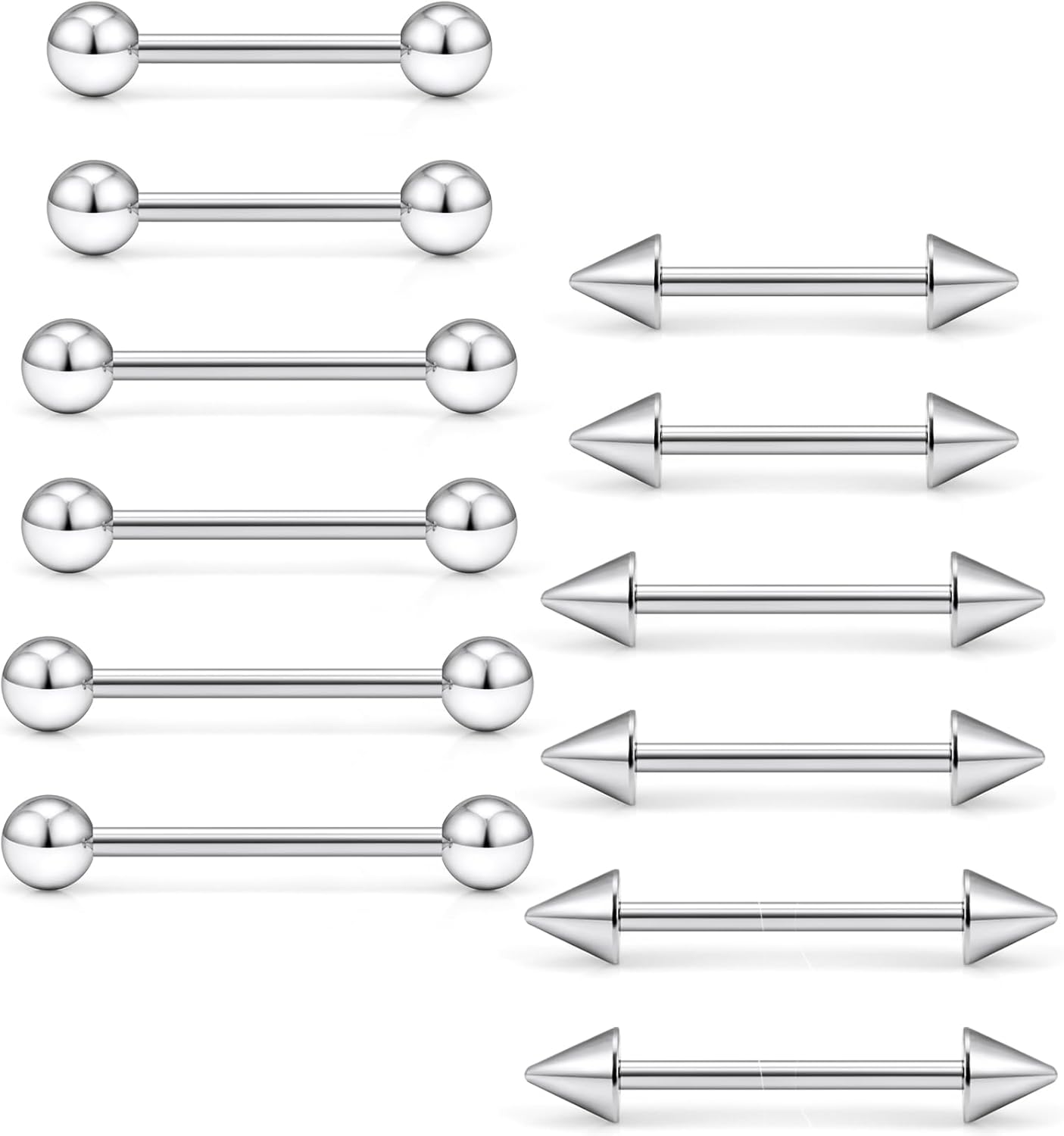 Ocptiy 14G Nipple Piercing Jewelry Tongue Rings Surgical Steel Silver Tongue Nipple Barbell Bar Piercing Jewelry for Women 14mm 16mm 19mm