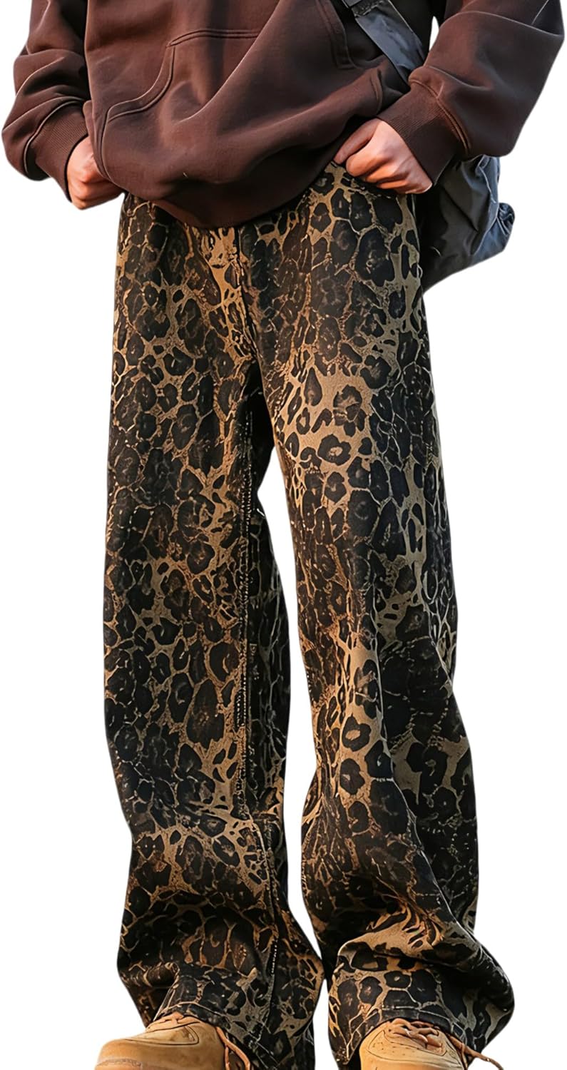 FantasyGears Stretchy Leopard Print Wide Leg Jeans for Women Men Streetwear Oversized Baggy Casual Pants