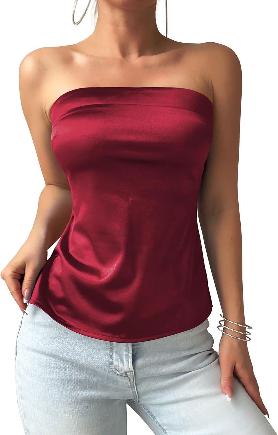 ZAFUL Women Satin Strapless Tube Tops Side Split Sleeveless Backless Bandeau Top Going Out Bustier Tops Silk Tank Top